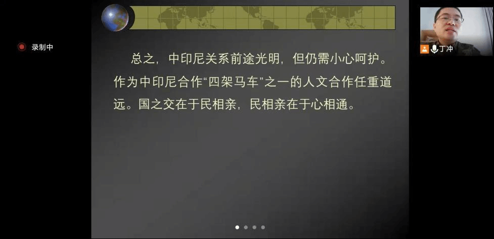 2021年9月9日上午10:00,由华中师范大学中印尼人文交流中心主办的“中印尼关系及印尼青年的中国观”专题讲座在线举行。印尼UMB大学(Universitas Mercu Buana)博士、湖北中医药大学青年教师丁冲老师应邀在线讲学交流。本次讲座由我校中印尼人文交流中心主任韦红教授主持,赵长峰教授、王勇辉副教授、刘明周副教授、张弦副教授、副主任陈菲副教授,以及含我校中印尼人文交流中心在内的多所高校及研究机构相关人员参加了本次讲座。