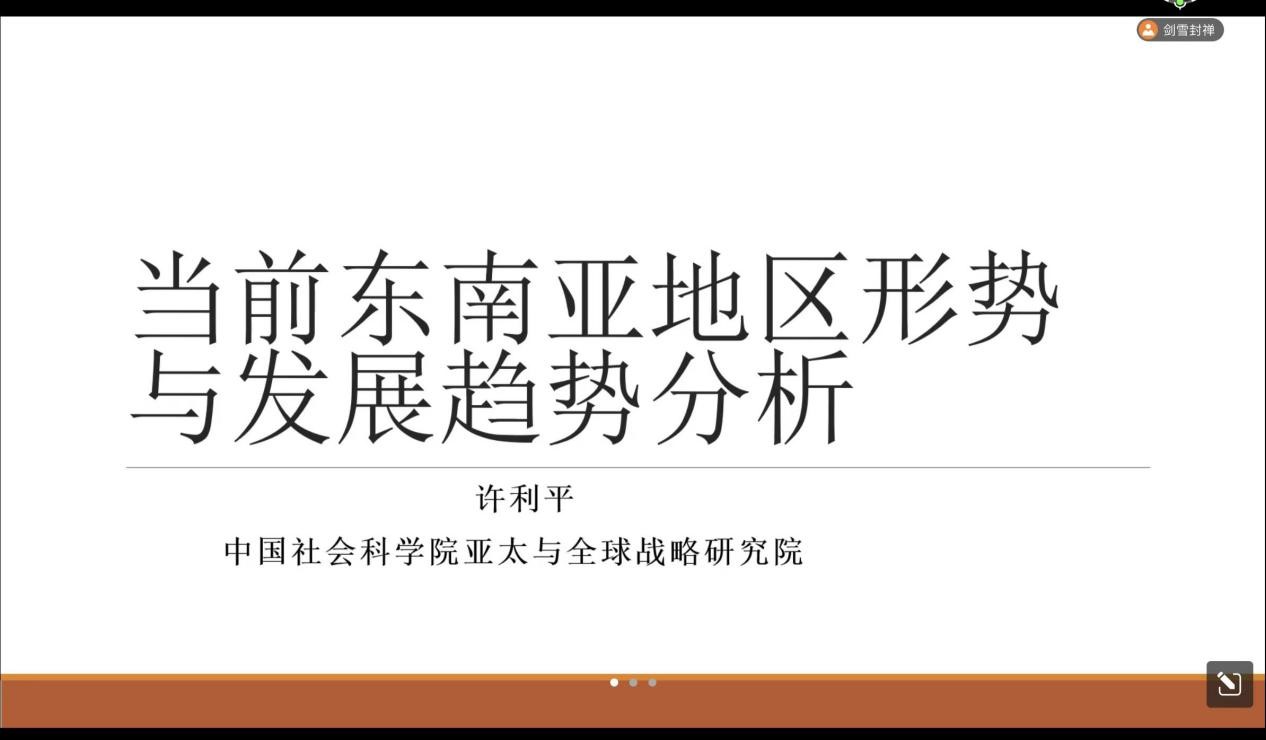 (通讯员:王伏林)11月3日上午,由华中师范大学政治学部主办,国际政治研究中心承办的“国际政治名家讲坛”第八期顺利举办。中国社会科学院亚太与全球战略研究院研究员许利平教授在线上作了题为“当前东南亚地区形势及趋势分析”的学术讲座,本次讲座由国际政治研究中心负责人韦红教授主持,国际政治专业2021级硕士生在政治与国际关系学院313会议室集中聆听。